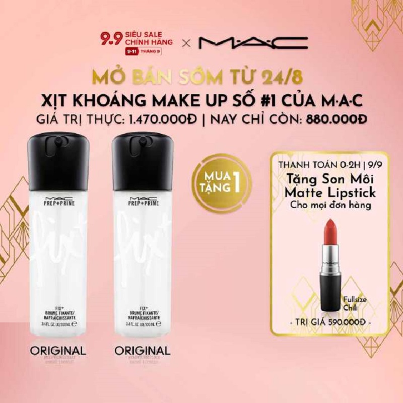 Ngoài ra, kem theo 1 thỏi son môi M.A.C Matte Lipstick trị giá 590.000 đồng khi thanh toán vào 0H – 2H duy nhất 09.09.