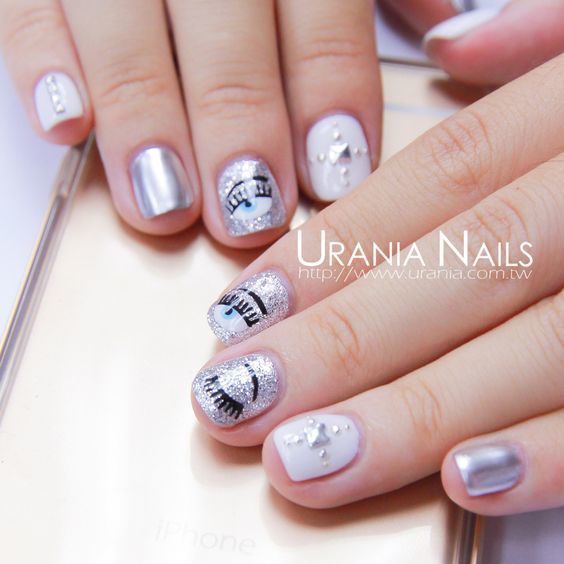 Nếu bạn muốn đôi bàn tay mình trở nên lấp la lấp lánh hãy thử ngay kiểu nail kim tuyến và họa tiết con mắt huyền bí này, chắc chắn sẽ không làm bạn thất vọng.