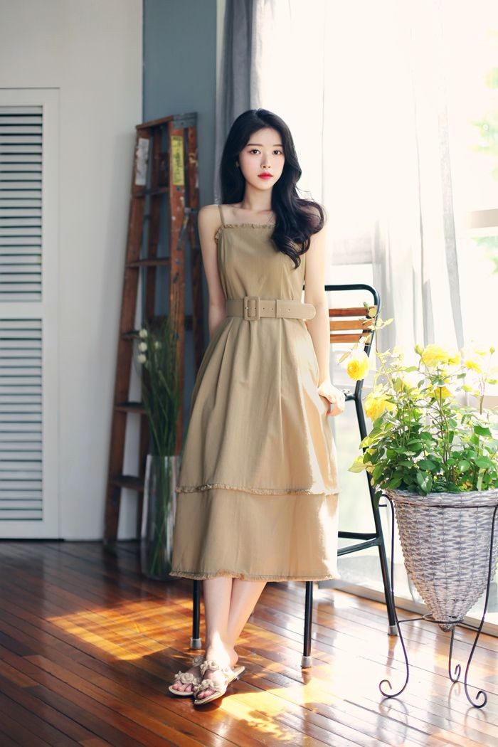 Tạo nên vẻ đẹp nền nã, thanh lịch với chiếc đầm dài màu be này cùng với đội sandal và chiếc túi dệt thủ công thêm chút cổ điển, trang phục này khá phù hợp với những nàng có chiếc eo nhỏ và dáng người mãnh mai.
